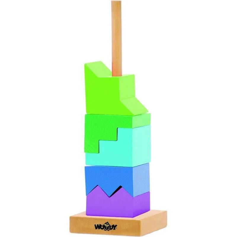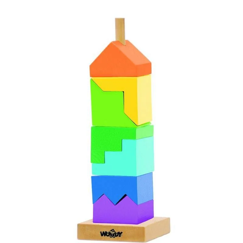 Krāsainas, dažādu formu koka klucīši, kas savērtas uz tapas, attīsta krāsu un formu izpratni.