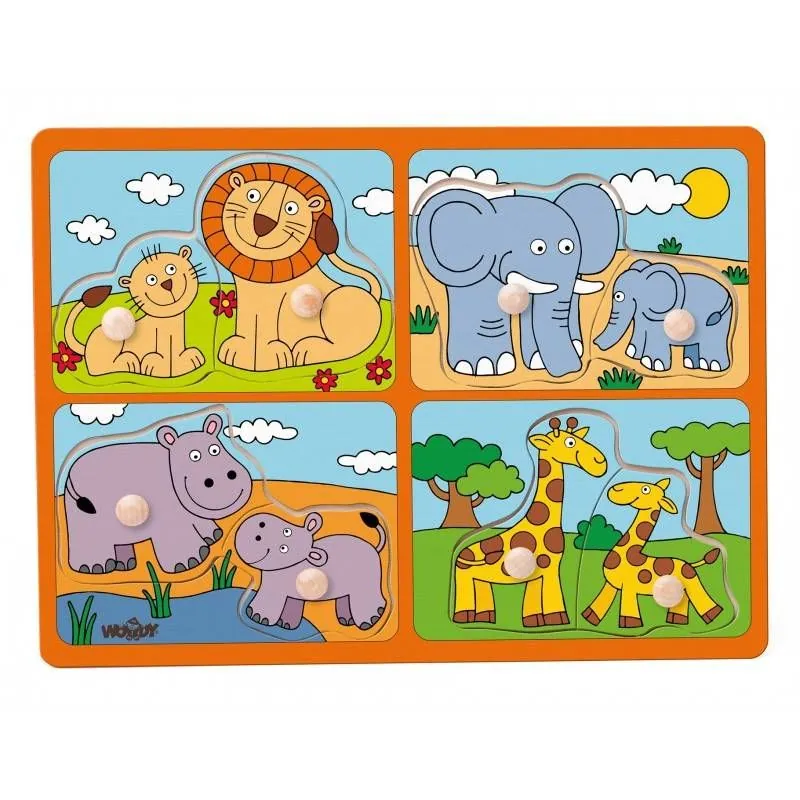 Koka puzles sastāv no 4 dažādiem dzīvniekiem, bet tām ir 8 dažāda izmēra formas. Šie zooloģiskā dārza iemītnieki ir lielisks risinājums, lai mācītu bērniem jaunas sajūtas un prasmes. Šis komplekts var būt viens no pirmajiem bērnu puzles komplektiem.Izmērs 29.5x22 cm.Komplektā 8 detaļas.Ražotāja ieteikums piemērots bērniem no 2 gadiem, bet ar vecāku uzraudzību lieliski derēs arī no viena gada vecuma.