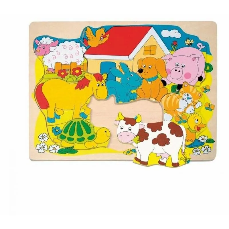 Koka puzle ar dažādu mājdzīvnieku formām. Visas detaļas noteiktā secībā savienojas dēlī. Izmēri: 30 x 32 cm.Piemērots lietošanai no 2 gadu vecuma.