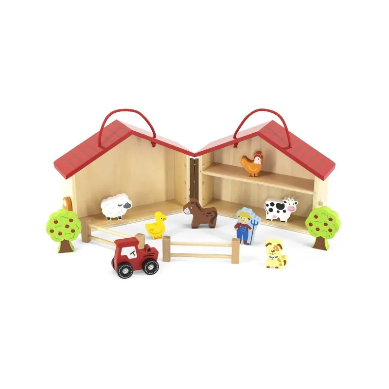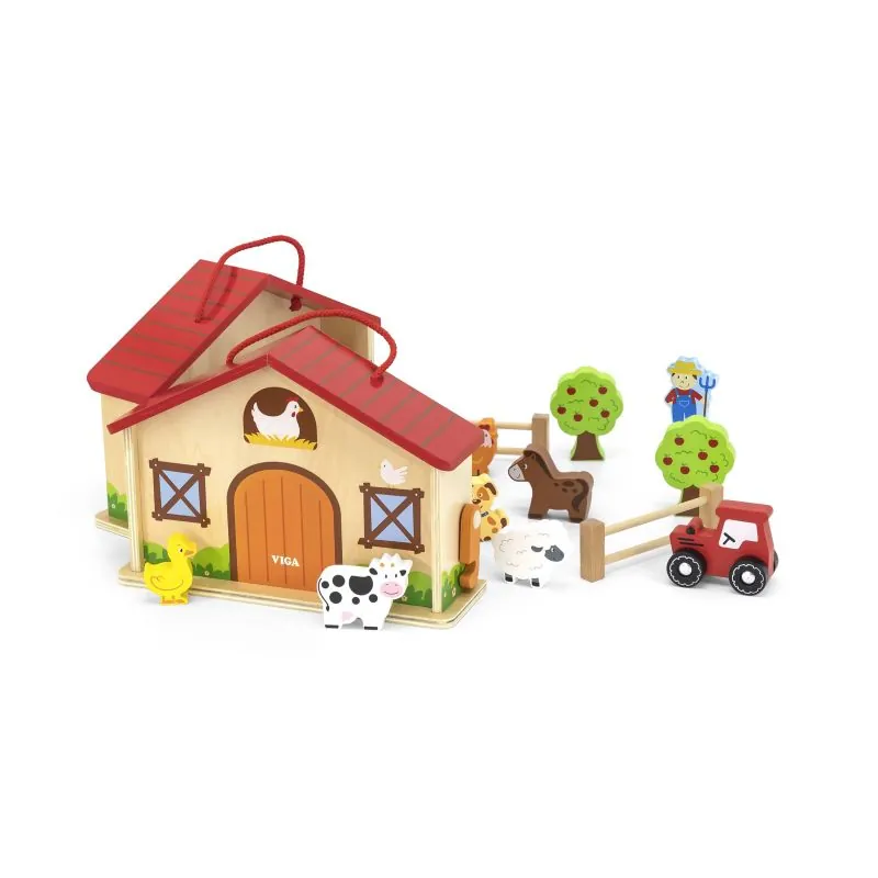 Nemelis ir ērtas rokturis, lai bērns varētu paņemt rotaļlietu tur, kur viņš vēlas.Komplektā jūs atradīsiet arī 6 koka dzīvniekus (suns, govs, gailis, aita, zirgs un pīle).Tāpat arī divi augļu koki, traktors, zemnieka figūriņa un divi žogi.Koka rotaļlieta atbalsta bērna attīstību: roku un acu koordināciju, iztēli, motoriskās prasmes.Koksne ir lakota un krāsota ar bērniem drošiem līdzekļiem.