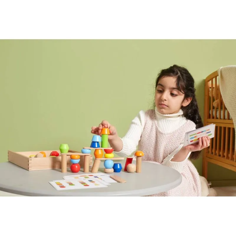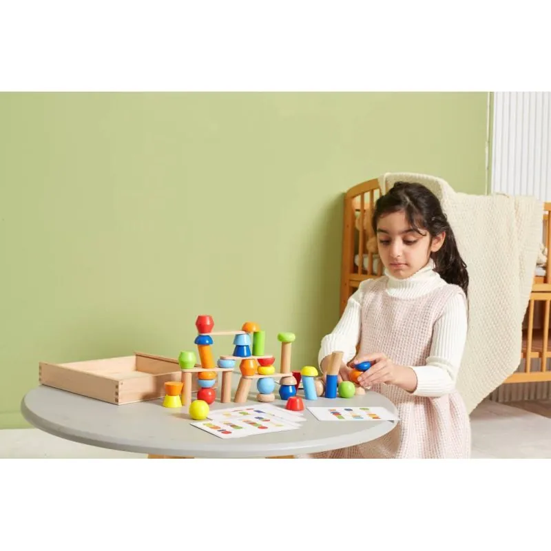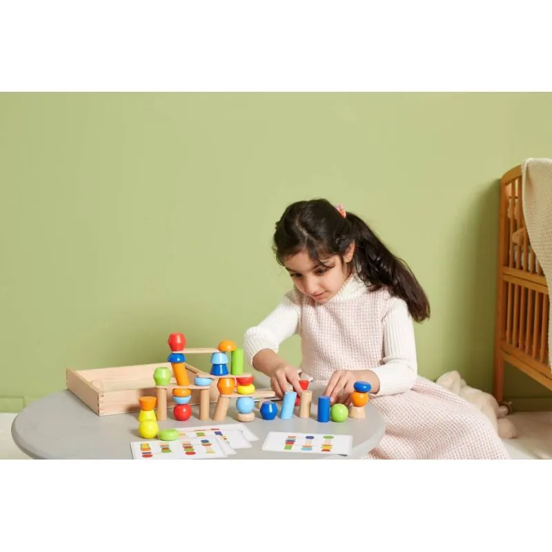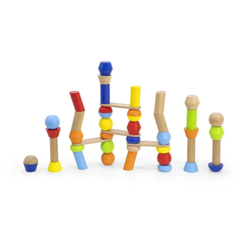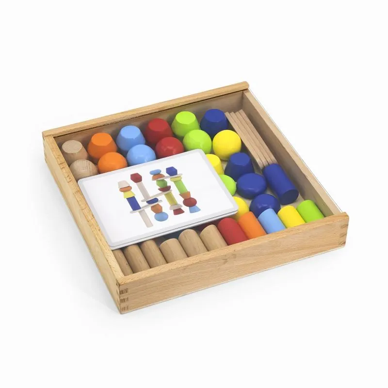 Kartes – ir trīs grūtības līmeņi. Spēlējot bērni atklās formas, krāsu kombinācijas un izmērus. Vienlaikus tiek attīstītas praktiskās prasmes, iztēle, radošums un loģiskā domāšana, kā arī roku kustību precizitāte un roku-acu koordinācija.Komplektā ietilpst:46 dažādu formu un krāsu klucīši6 divpusējas kartītes ar būvniecības ieteikumiemKoka uzglabāšanas kasteVisi priekšmeti ir izgatavoti no dižskābarža koka un krāsoti ar netoksiskām maigām krāsām, kas piesaistīs uzmanību un veicinās kopīgu spēlēšanos, sniedzot daudz prieka.Vigos prioritāte – bērnu drošība un augstākā rotaļlietu kvalitāte, tāpēc rūpējas, lai krāsas, ar kurām tiek krāsotas rotaļlietas, nebūtu toksiskas un atbilstu drošības standartiem (EN71 un ASTM).Rotaļlieta paredzēta bērniem, kas vecāki par 36 mēnešiem.
