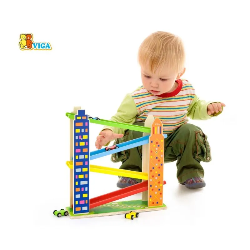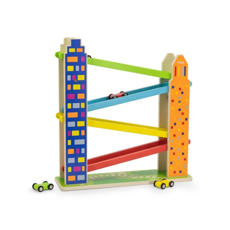 Pilsētas automašīnu trase - rotaļlieta krāsainām automašīnām. Ceļš uzstādīts starp diviem torņiem, kuru forma un grafika attēlo pilsētas debesskrāpjus. Trase ir vienkārša, bet jautra dizaina. Tās krāsas ir draudzīgas bērniem un piesaista viņu uzmanību. Komplektā ietilpst 4 koka automašīnas.Spēle ar trasēm un mašīnītēm attīsta bērna motoriku un palīdz attīstīt spēju saprast cēloni un sekas. Var būt jautri gan individuāli, gan ar citiem bērniem. Tā ir lieliska iespēja patīkamā atmosfērā apgūt sadarbību un konkurenci. Bērni var eksperimentēt ar rotaļu mašīnīšu gravitāciju, ātrumu un kustības virzienu. Rotaļlieta veicina atklāšanu, mācīšanos un spēlēšanos pievilcīgā un izglītojošā veidā.Visa rotaļlieta izgatavota no dižskābarža koka un krāsota ar netoksiskām krāsām. Krāsas ir 100% drošas un atbilst EN71 un ASTM drošības standartiem.Iepakojums lieliski piemērots dāvanai.Vecums: 18+