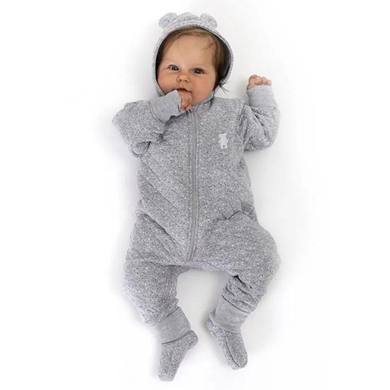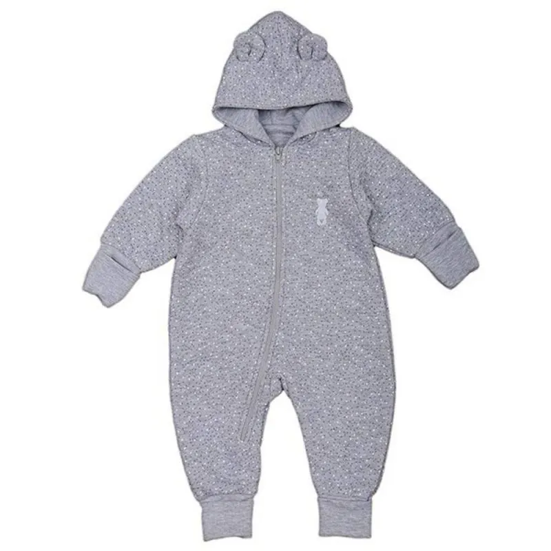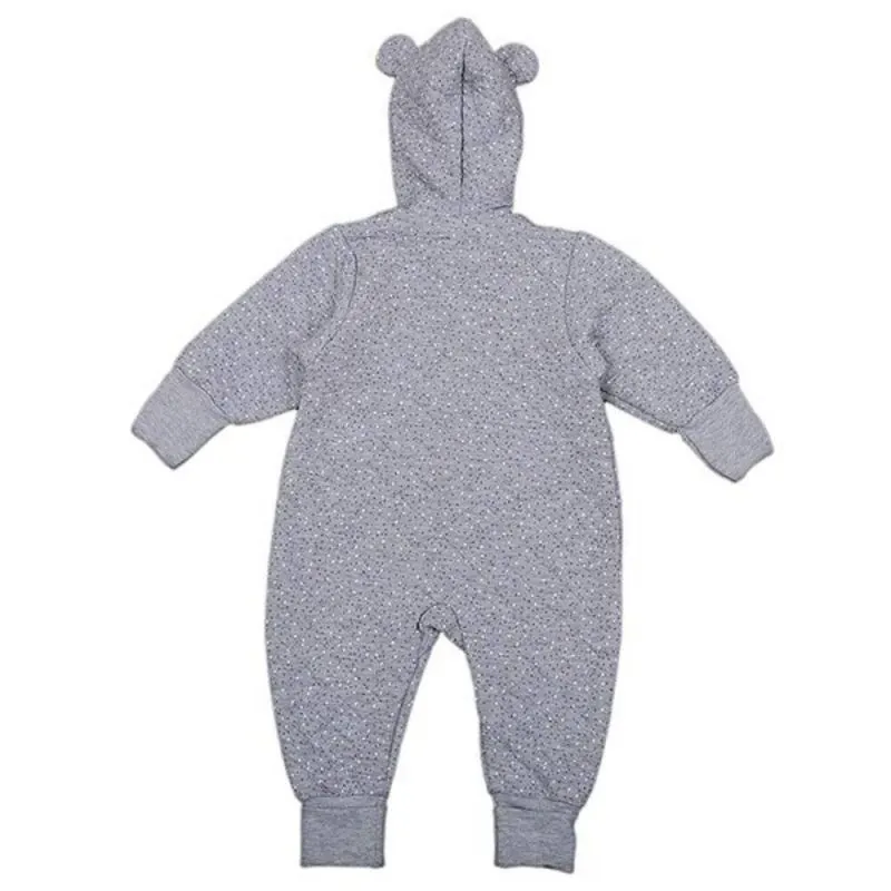 Kokvilnas kombinezons zīdainim ar kapuciPriekšpusē aizdarāms ar rāvējslēdzējuĀrpuse un odere izgatavotas no kokvilnas, iekšpusē plāns siltinājumsKrāsa: pelēkaKombinezons piemērots pavasarim/vasarai, vēsiem vasaras vakariemRažots Lietuvā