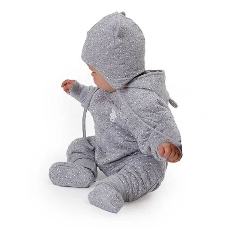 Kokvilnas kombinezons zīdainim ar kapuciPriekšpusē aizdarāms ar rāvējslēdzējuĀrpuse un odere izgatavotas no kokvilnas, iekšpusē plāns siltinājumsKrāsa: pelēkaKombinezons piemērots pavasarim/vasarai, vēsiem vasaras vakariemRažots Lietuvā