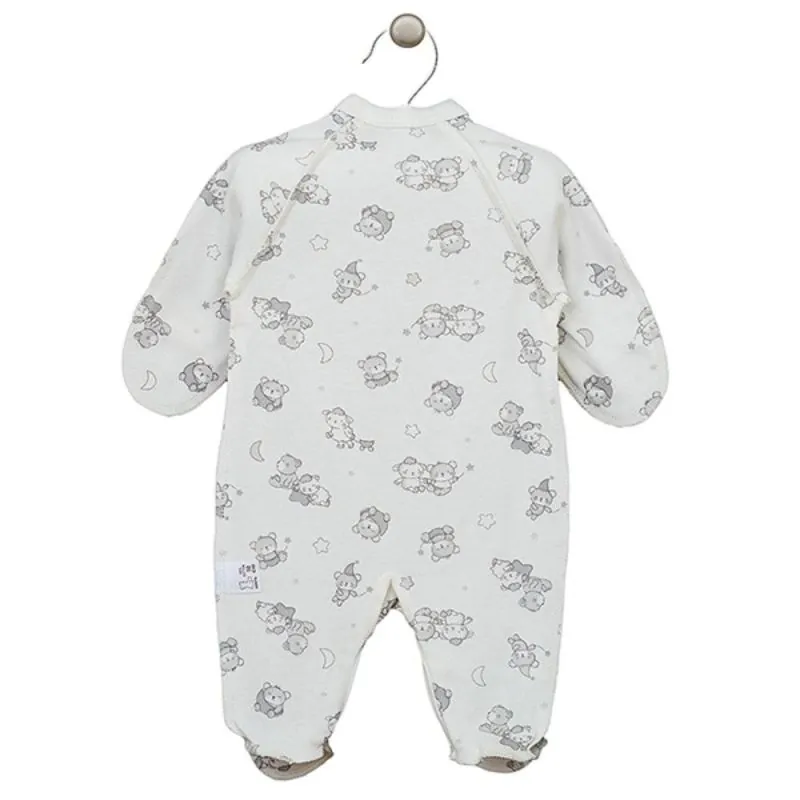 Ar garām piedurknēm;Ar atliekamām cimdiņām;Ar slēgtām pēdiņām;Izgatavots no mīksta un maiga trikotāžas, sertificēts ar Oeko-tex standartu 100.Aizdarāms ar spiedpogām priekšpusē līdz pat pēdiņām;Apsienams;Augstas kvalitātes apģērbs atbilst ES standartiem.Krāsa: krēmkrāsas;Izgatavots Lietuvā;