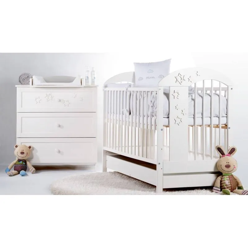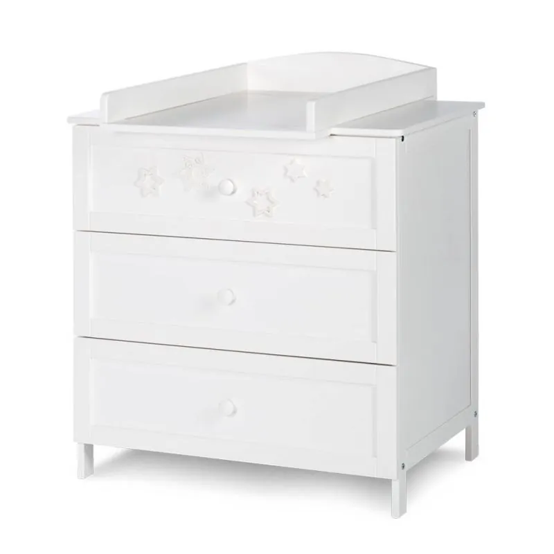 Izgatavots no dabīga koka - priedes masīva;Pieejama tās pašas kolekcijas gultiņa;Trīs atvilktnes;Ar atvilktnēm un pārtinamo galdu;Viegli noņemams/uzliekams rāmis pārtinamajai virsmai;