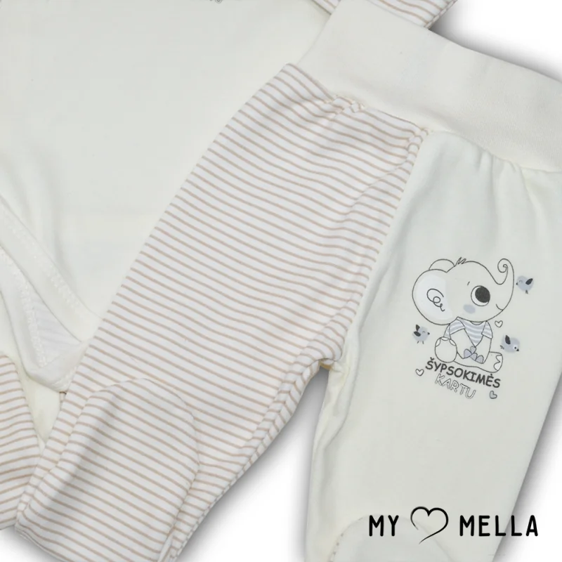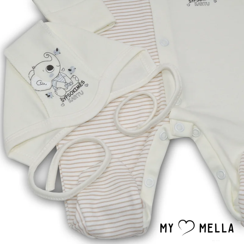 Mīksts kokvilnas 4 daļu komplekts zīdaiņiem un jaundzimušajiem.Visi apģērbi ar apgrieztām šuvēm.Komplektu veido:Garroku slīdņi ar aizveramām cimdiņām, garroku bodijs ar aizveramām cimdiņām, bikses ar pēdiņām, cepurīte.Izgatavots no sertificēta, kvalitatīva, mīksta un maiga trikotāžas.Mazgāt 40 grādu temperatūrā.Izveidots Lietuvā!
