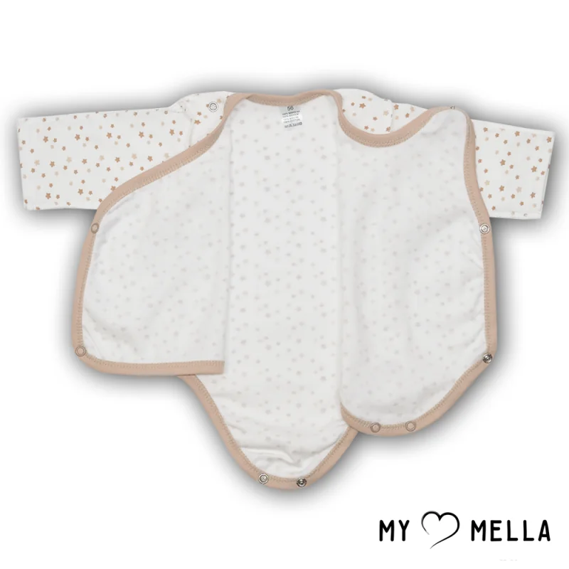 Mīksts kokvilnas 5 daļu komplekts zīdaiņiem un jaundzimušajiem.Visi apģērbi ar izgrieztām šuvēm.Komplektā ietilpst:Garroku slīdnis ar uzlocāmām cimdiņām, aizverams bodijs ar garām piedurknēm un uzlocāmām cimdiņām, bikses ar pēdiņām, jaciņa ar uzlocāmām cimdiņām, cepurīte.Izgatavots no sertificēta, kvalitatīva, mīksta un maiga trikotāžas.Mazgāt 40 grādu temperatūrā.Izveidots Lietuvā!