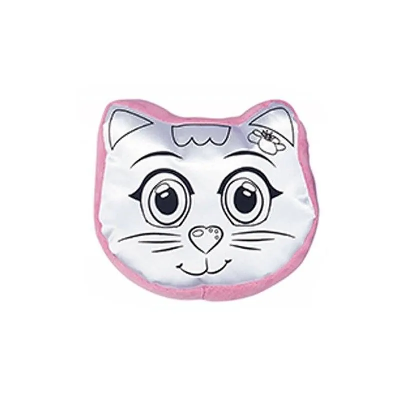 Kastītē ir kaķēna formas dekoratīvais spilventiņš un 4 krāsaini marķieri, ar kuriem varēs izkrāsot attēlu un tādējādi izrotāt spilvenu.
