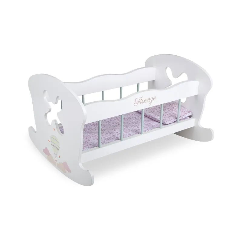 Gultiņa krāsota baltā krāsā, rotāta ar pasteļtoņu gaisa baloniem.Komplektā ar gultas veļu.Šūpulī var gulēt mazulis līdz 45 cm.Lelles gultiņa ir roku darbs, pārdomāta līdz sīkākajām detaļām un izgatavota ļoti rūpīgi.Lielisks līdzeklis, lai veicinātu bērnu aktīvu radošu darbību.Tas ir ilgmūžīgs rotaļlieta, ar kuru jūsu bērns varēs priecāties vēl ļoti ilgi.Produkts ir sertificēts ar CE zīmi un ir pilnīgi drošs bērniem.Ieteicamais vecums no 3 gadiem.Gultas izmēri: 50 x 39,5 x 29,5 cm.Izgatavots no augstākās kvalitātes koka.Svars 2.83 kg.Izgatavots Spānijā, īpašā Arias (Spānija) pasūtījumā.