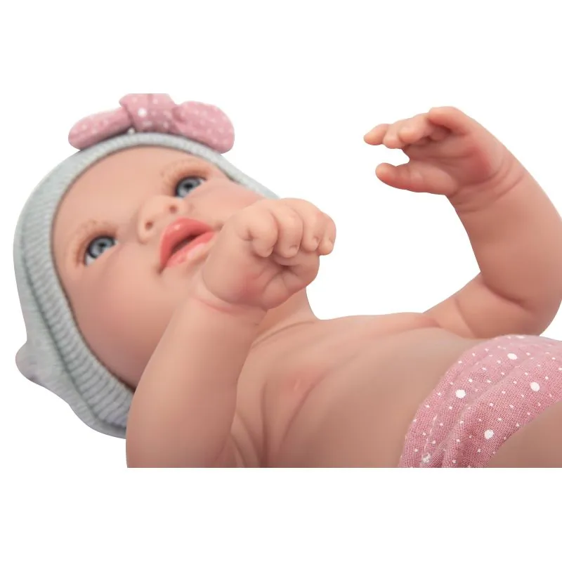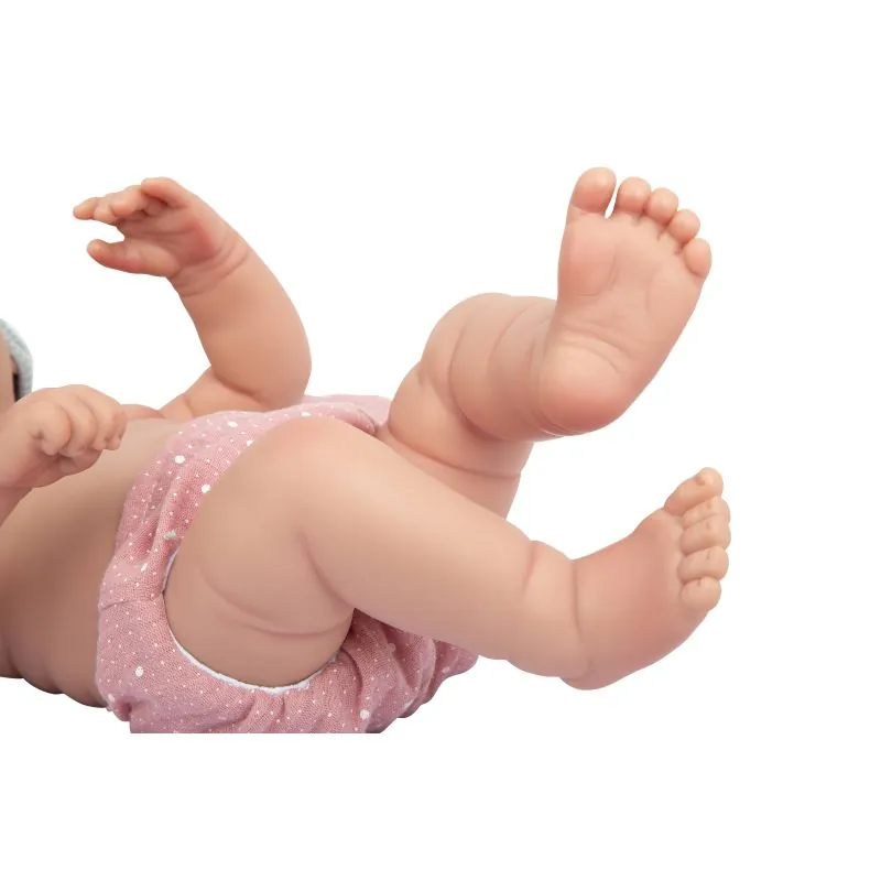 Lelles acis ir ļoti izteiksmīgas, rada reālistiska skatiena iespaidu.Lelle ir apģērbta ar biksītēm, cepurīti, zeķītēm, cimdiņiem un cepurīti.Visi apģērbi ir roku darbs, pārdomāti līdz sīkākajai detaļai un izgatavoti ļoti rūpīgi. Ir priekšautiņš un zīdītājs.Komplektu papildina speciāls pleds.Lelles kājas un rokas ir elastīgas, to var sēdināt, stāvēt, mainīt pozas, ērti apģērbt.Lelle ir izgatavota no polivinila - maiga, mīksta materiāla.Lelli var mazgāt.Piemērota pārvadāšanai bērnu leļļu ratiņos.Iepakojums: liela, kartona kaste ar caurspīdīgu logu. Tā ir patiešām lieliska dāvanas ideja.Lelles augstums: 42 cm.Droša un piemērota spēlēšanai bērniem no 2+ gadiem.Lelle ir sertificēta ar CE zīmi, tāpēc ir pilnīgi droša bērniem.Lelles un tās apģērbu izcelsmes valsts: Spānija.