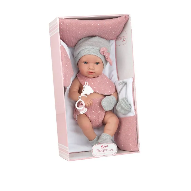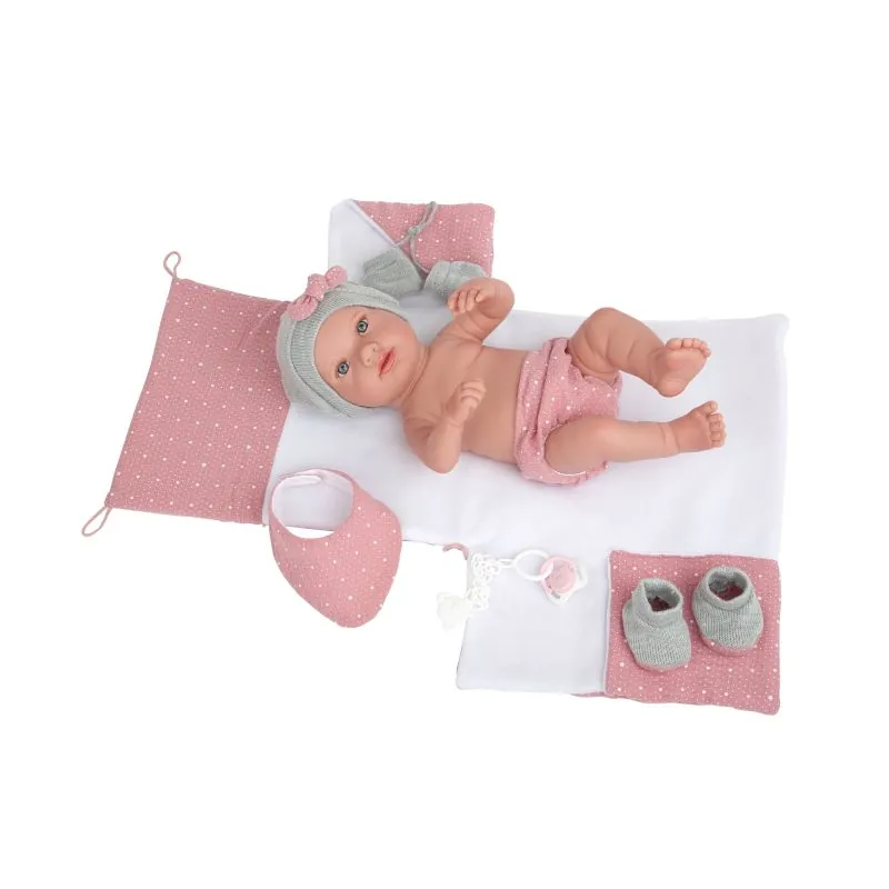 Lelles acis ir ļoti izteiksmīgas, rada reālistiska skatiena iespaidu.Lelle ir apģērbta ar biksītēm, cepurīti, zeķītēm, cimdiņiem un cepurīti.Visi apģērbi ir roku darbs, pārdomāti līdz sīkākajai detaļai un izgatavoti ļoti rūpīgi. Ir priekšautiņš un zīdītājs.Komplektu papildina speciāls pleds.Lelles kājas un rokas ir elastīgas, to var sēdināt, stāvēt, mainīt pozas, ērti apģērbt.Lelle ir izgatavota no polivinila - maiga, mīksta materiāla.Lelli var mazgāt.Piemērota pārvadāšanai bērnu leļļu ratiņos.Iepakojums: liela, kartona kaste ar caurspīdīgu logu. Tā ir patiešām lieliska dāvanas ideja.Lelles augstums: 42 cm.Droša un piemērota spēlēšanai bērniem no 2+ gadiem.Lelle ir sertificēta ar CE zīmi, tāpēc ir pilnīgi droša bērniem.Lelles un tās apģērbu izcelsmes valsts: Spānija.