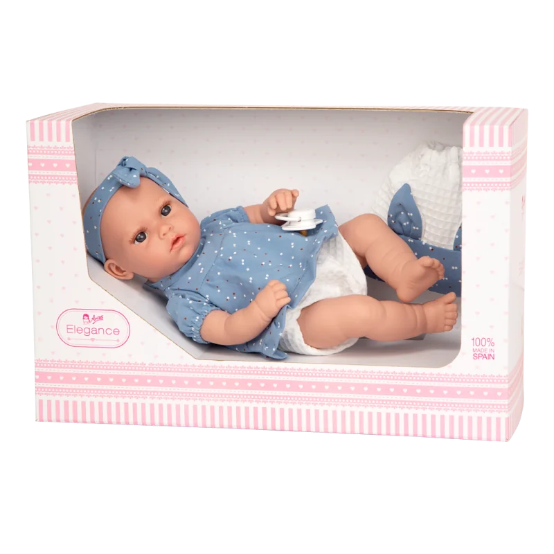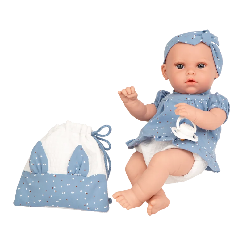 Lelles acis ir ļoti izteiksmīgas, rada reālistiska skatiena iespaidu.Ir skaņas efekts. Nospiežot vēderiņu, raud. Komplektā ietilpst baterijas.Lelles lūpas ir atvērtas, lai varētu ievietot knupīti.Vēderiņš ir auduma, jo ir ievietots mehānisms;Lelles ir izgatavotas no polivinila - ļoti maiga un mīksta materiāla.Lelli var likt jebkurā lelles ratiņos.Lelle ir apģērbta punktainos zilganos un baltos apģērbos.Visi apģērbi ir roku darbs, pārdomāti līdz sīkākajai detaļai un izgatavoti ļoti rūpīgi.Piemērota vešanai bērnu lelles ratiņos.Komplektā ietilpst bērnu knupītis un maisiņš lelles aksesuāriem.Lelles augstums: 33 cm.Iepakojums: firmas, krāsaina kartona kastīte;Kastītes izmēri 37 x 17.50 x 23.50 cmDroša un piemērota spēlēšanai bērniem no 2+ gadiem.Visas lelles ir sertificētas ar CE zīmi.Lellu un to apģērbu izcelsmes valsts - Spānija.