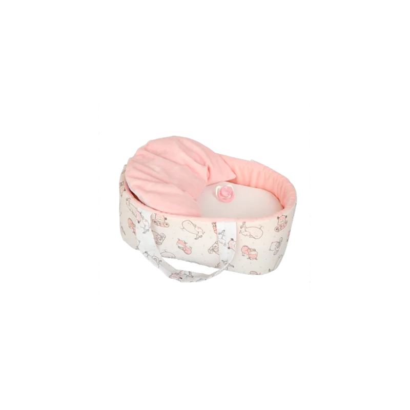 - Lelle ir apģērbta gaišās drēbēs ar rozā akcentiem un ielikta nesējā ar dzīvnieciņiem.