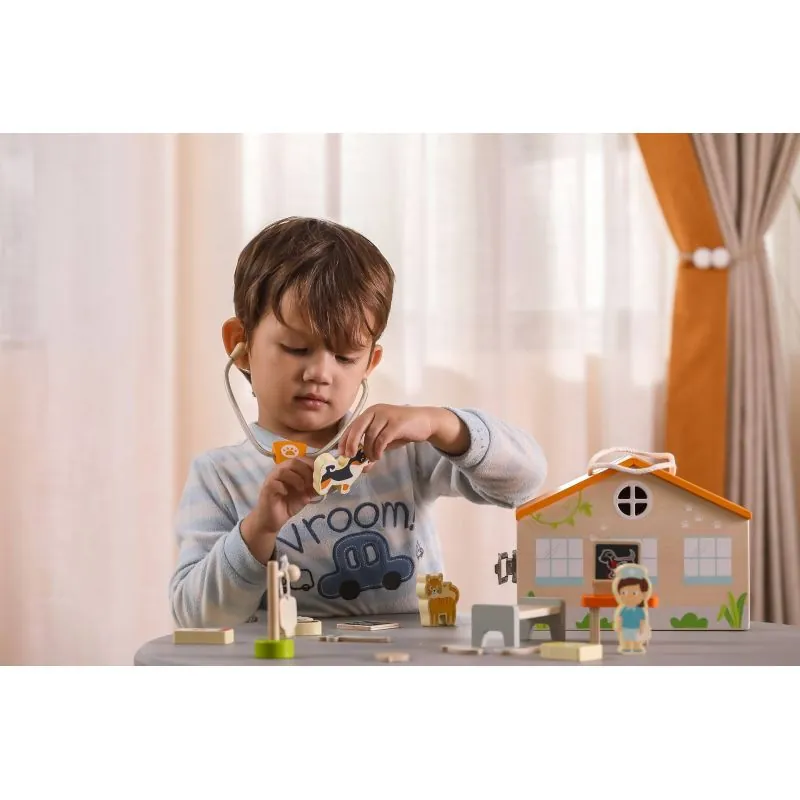 Šis brīnišķīgais komplekts iedvesmos jūsu bērna iztēli un ļaus mazulim spēlēt veterinārārsta lomu.Koferis kalpo kā klīnikas ēka. Ir ērti rokturi, lai bērns rotaļlietu varētu paņemt līdzi visur, kur vēlas.Komplektā ietilpst: 4 figūras (ārsts, medmāsa, kaķis un suns), gulta, pilināmā galda, monitors, stetoskops, termometrs, zāles,rotaļlietas dzīvniekiem.Rotaļlieta ir aizslēdzama ar metāla slēdzeni un neļaus pazaudēt figūras.Spēlējot attīstās:roku un acu koordinācija,roku veiklība,iztēle,motoriskās prasmes.Spēlējiet ar „Viga“ rotaļlietām, kas palīdz jūsu bērnam attīstīt loģisko domāšanu un motoriskās prasmes.Krāsas un tintes uz „Viga“ rotaļlietām ir netoksiskas, drošas bērnam.Visas rotaļlietas atbilst Eiropas rotaļlietu drošības EN71 un ASTM standartiem.