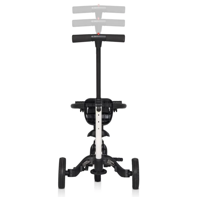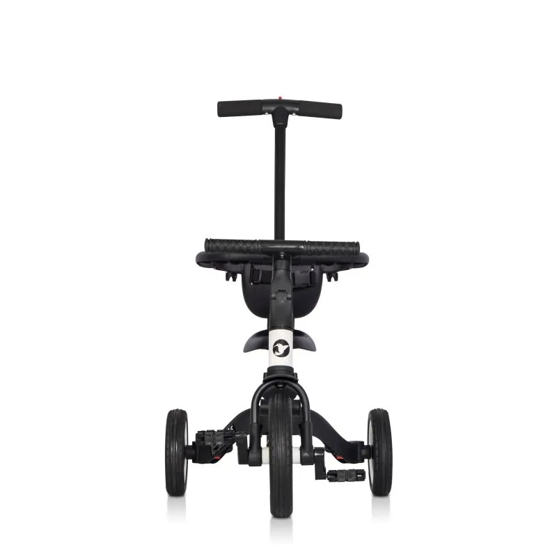 4. Balansinis dviratis – 3-4 metų vaikams. Dėl naujos patentuotos sistemos, paspaudę vos 3 mygtukus ir neišardydami jokių elementų, triratį galite paversti praktišku mokomuoju balansiniu dviračiu. Tiesiog sujunkite galinius ratus į vieną stabilų dvigubą ratą ir nuimkite pedalus. Pedalus galima nuimti paspaudus tik vieną mygtuką ir nereikia jokių įrankių. Balansinis dviratis laikomas geriausiu būdu išmokti važiuoti dviračiu. Jūsų vaikas greitai išmoks išlaikyti pusiausvyrą ir perėjimas prie įprasto dviračio bus tik formalumas. Šioje konfigūracijoje pedalai, atlošas ir stumimo rankena pašalinami.