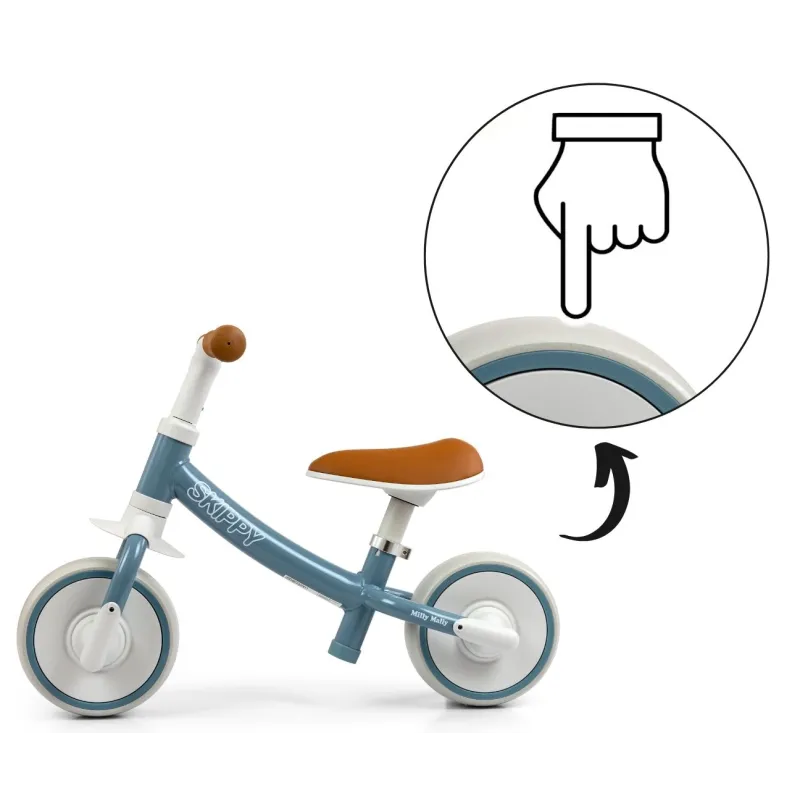 Milly Mally Skippy balansinio dviratuko ergonomiška forma suteikia neprilygstamą komfortą važiuojant ir taisiklingą vaiko laikyseną. Tinka vaikams nuo 18 mėnesių.