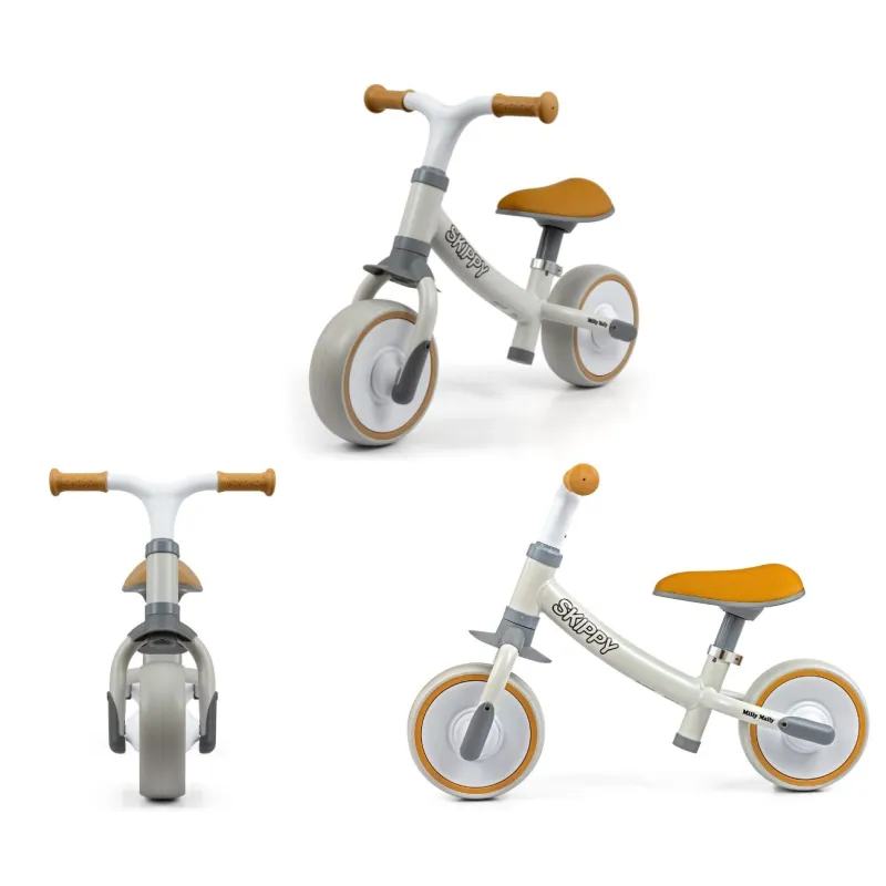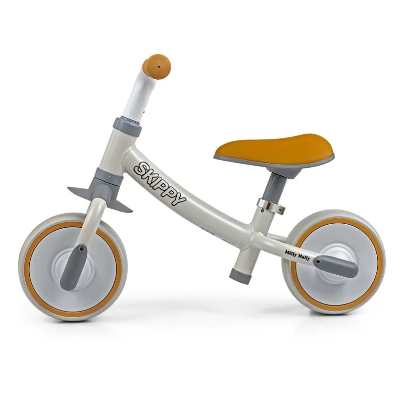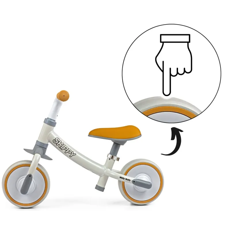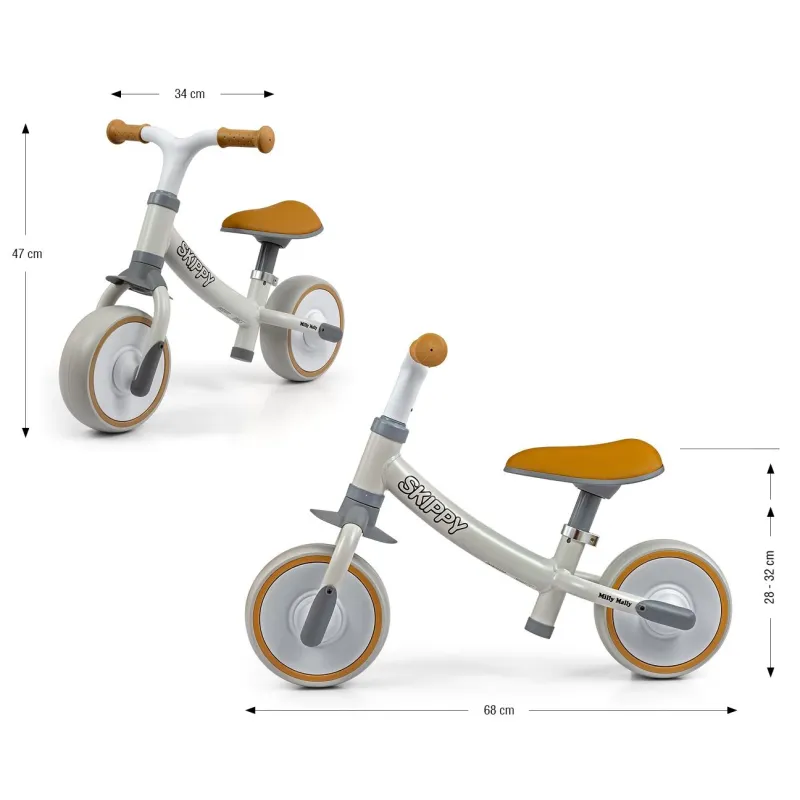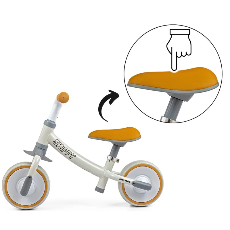 Milly Mally Skippy balansinio dviratuko ergonomiška forma suteikia neprilygstamą komfortą važiuojant ir taisiklingą vaiko laikyseną. Tinka vaikams nuo 18 mėnesių.