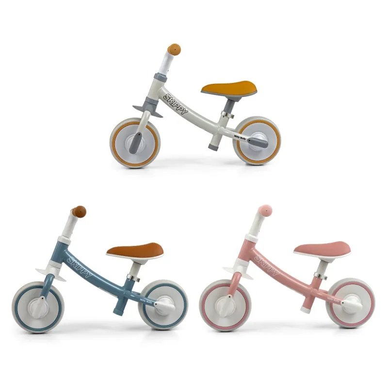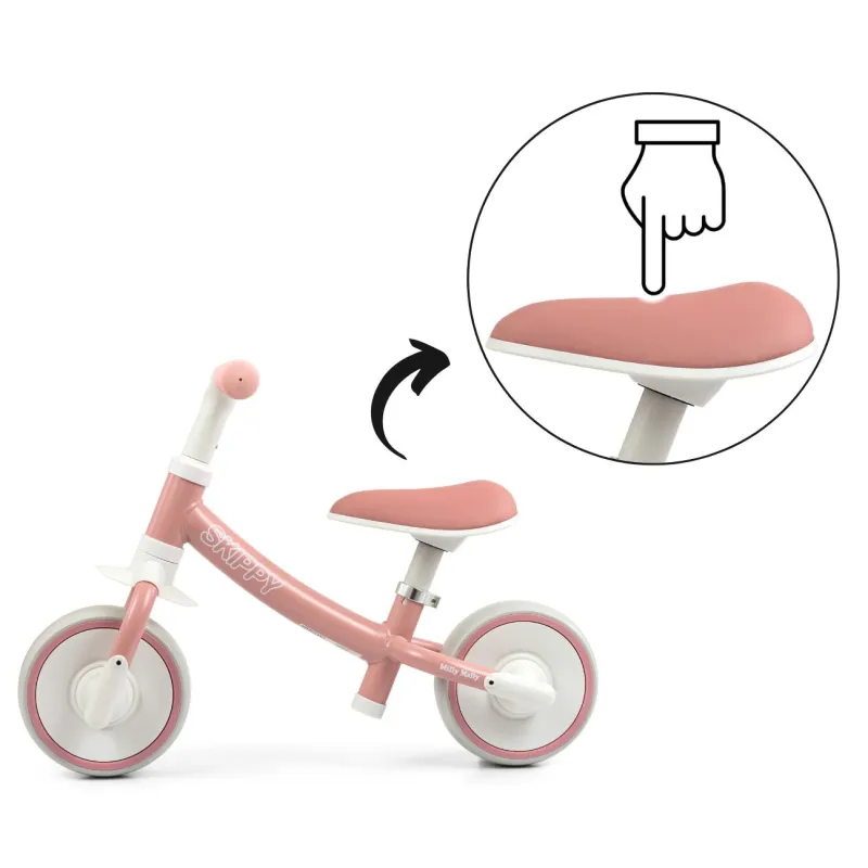 Milly Mally Skippy balansinio dviratuko ergonomiška forma suteikia neprilygstamą komfortą važiuojant ir taisiklingą vaiko laikyseną. Tinka vaikams nuo 18 mėnesių.