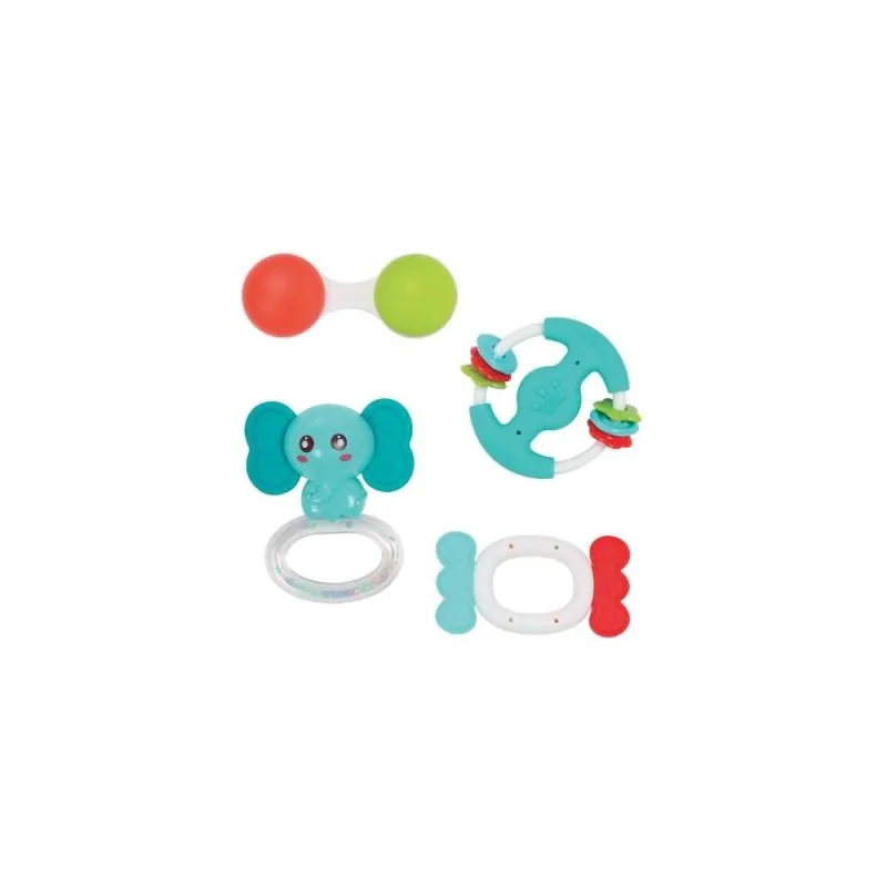 4 barškučių rinkinys - puikiai tinka lavinti ankstyvuosius smulkiosios motorikos įgūdžius.