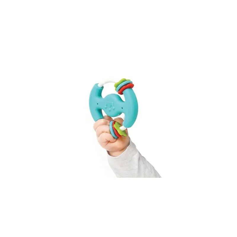 Ryškios spalvos ir barškantys karoliukai atkreipia ir padeda išlaikyti mažylio dėmesį.