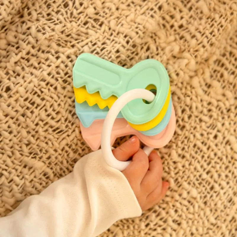 Tinkamai parinkta barškučio forma leidžia patogiai suimti ir laikyti mažose rankose. Specialūs skirtukai skatina lytėjimą.