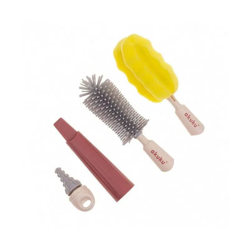 Komplektą sudaro šepetėlis su minkštais silikoniniais šereliais, užtikrinančiais butelių ir vandens butelių plovimą be įbrėžimų bei keičiamo kempinės antgalio, kuris profiliuotas, kad buteliuką išvalytų dar kruopščiau. Tinkamai profiliuotas antgalis pasiekia sunkiai pasiekiamas vietas, o patogi neslystanti rankena užtikrina stabilų sukibimą.