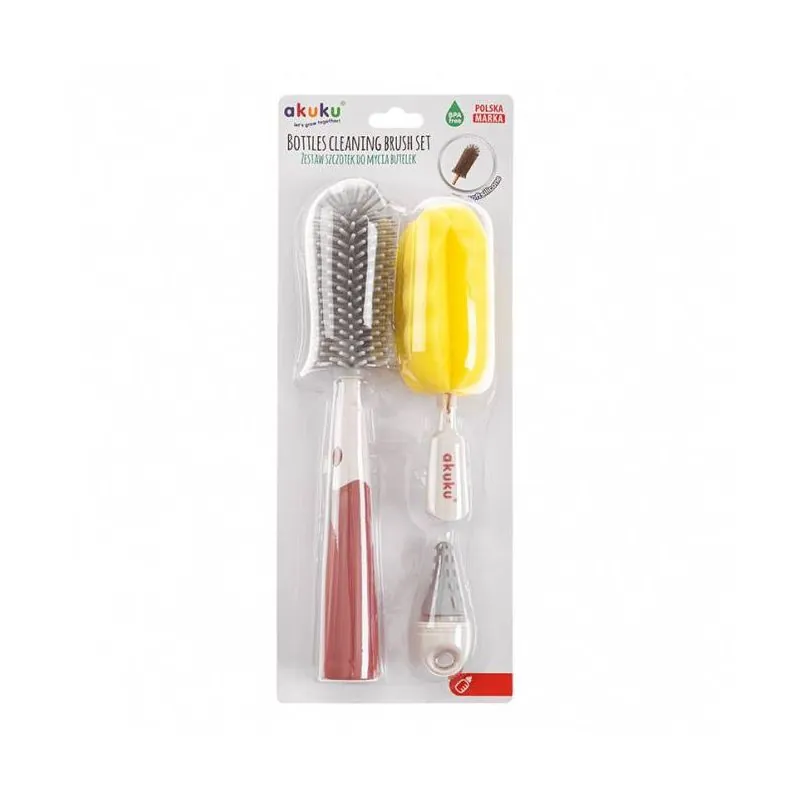 Komplektą sudaro šepetėlis su minkštais silikoniniais šereliais, užtikrinančiais butelių ir vandens butelių plovimą be įbrėžimų bei keičiamo kempinės antgalio, kuris profiliuotas, kad buteliuką išvalytų dar kruopščiau.