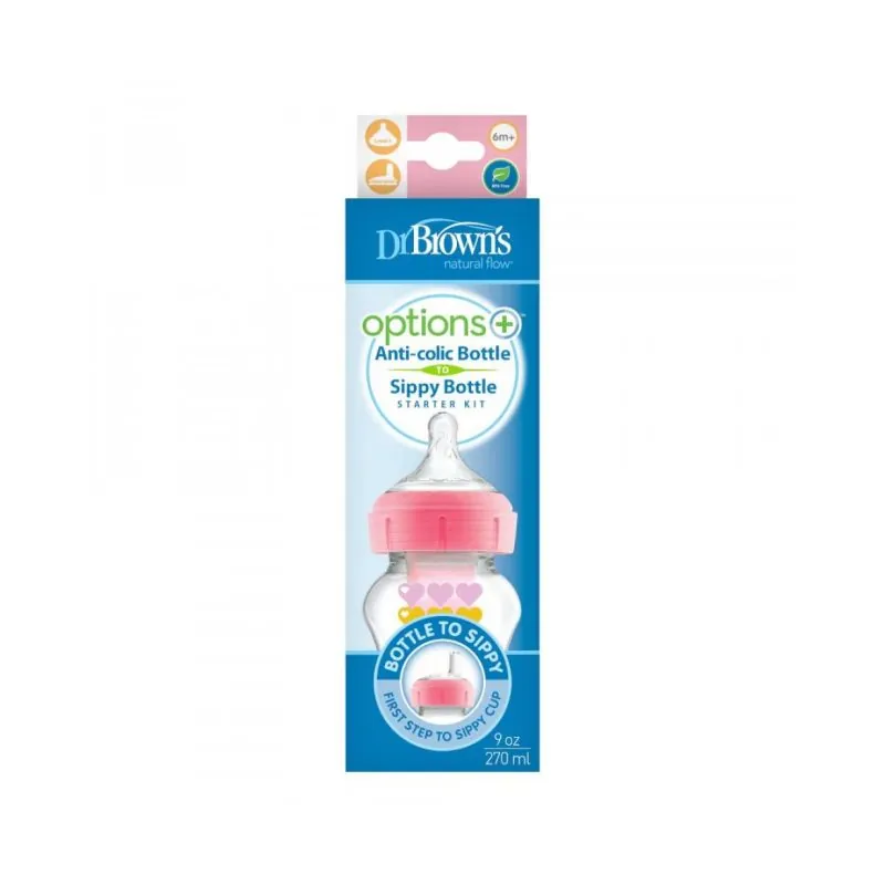 DR.BROWN'S buteliukas pereinamasis OPTIONS+ plačiu kakleliu, rožinis 270ml + silikoninis snapelis
