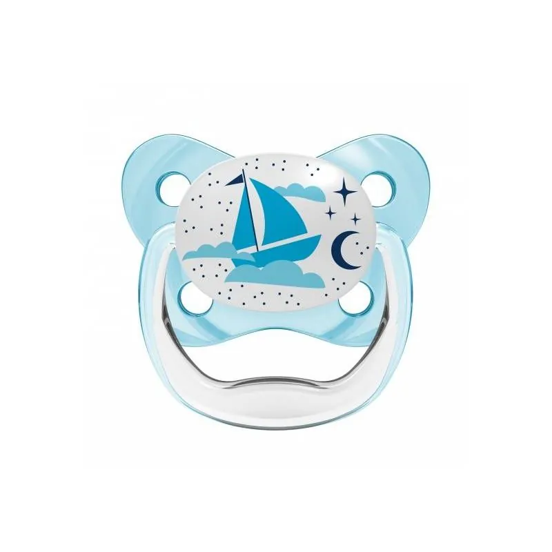 Tamsoje šviečiantis, minkštas, nesusitraukiantis, su patentuotu oro kanalu, silikoninis čiulptukas.