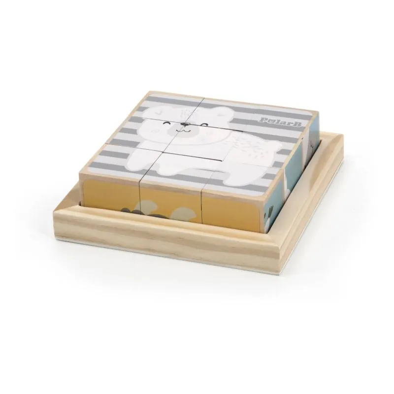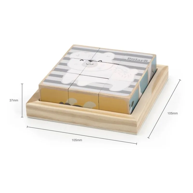 Rinkinyje yra 9 kaladėlės su 6 spalvingomis nuotraukomis, vaizduojančiomis gyvūnus: meškiukas, lapė, zebras, ežiukas ir dramblys.