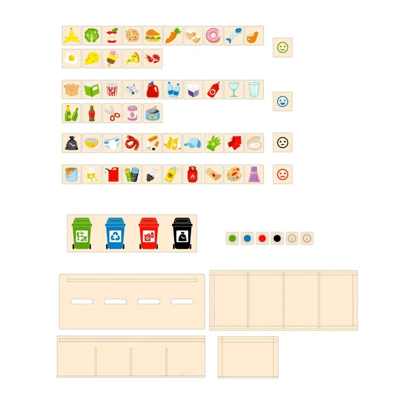 Kiekviena plytelė turi skirtingą atliekų atvaizdą vienoje pusėje, o kitoje – šypsenėlę, kurios spalva atitinka atliekų grupę (dėžutę), kuriai ji priklauso.