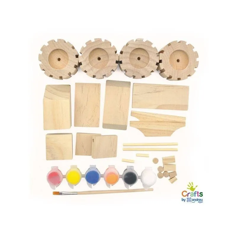 Rinkinys, kuriame rasite visas reikiamas dalis norint sukonstruoti visureigį - automobilš. Rinkinyje rasite medines plokšteles, klijus ir dažus.