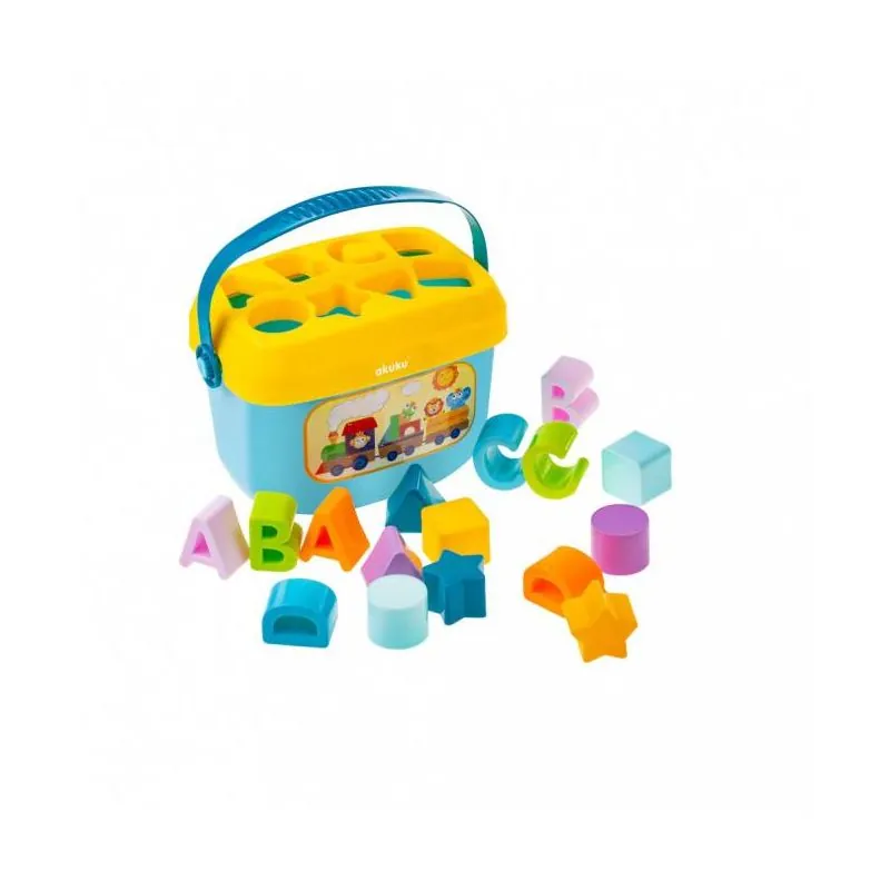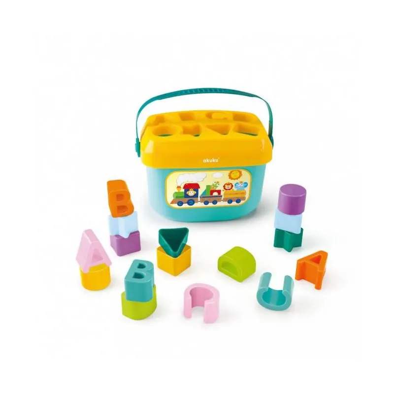 Akuku kaladėlės moko vaiką lyginti formas ir spalvas, mažylis jas rūšiuoja, išdėlioja ir priderina prie kibiro dangtelio skylučių.