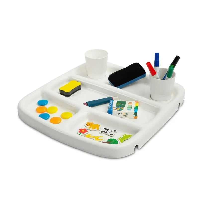 Į rinkinį įeina - žymeklis, kreida, kempinėlė, lentynėlė su indeliais dauktams susidėti;