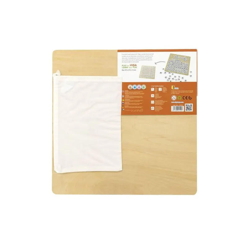 Medinėje lentoje yra 100 kaladėlių, kurių vienoje pusėje yra atspausdintos raidės, o kitoje - skaičiai ir matematiniai simboliai.