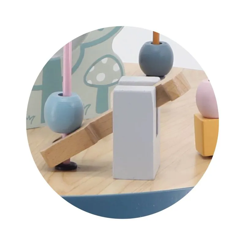 Metalinėse kilpose yra spalvingos medinės kaladėlės ir trys kaladėlės su gyvūnų atvaizdu - meška, lapė ir ežiukas.
