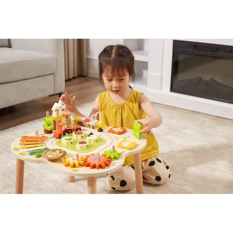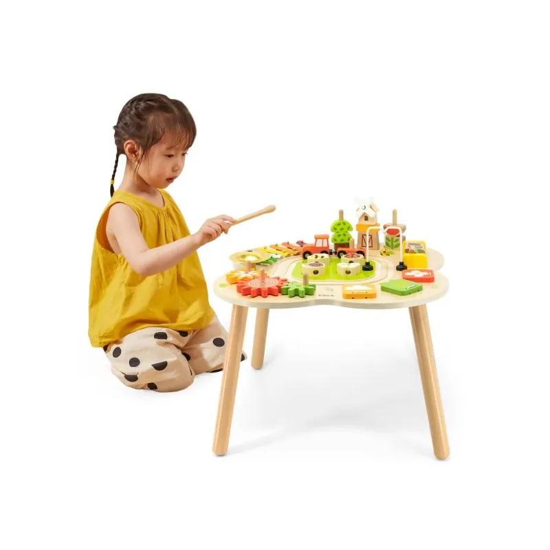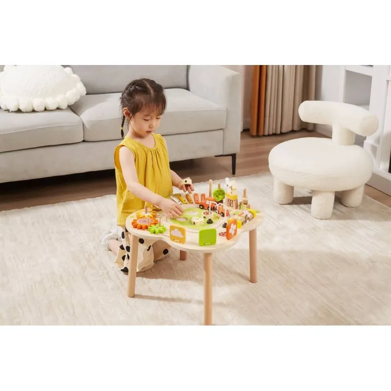 Šis medinis stalas skatina tėvus būti su vaiku ir parodyti jam detales ir elementus, kuriuos jis mato ant stalo.
