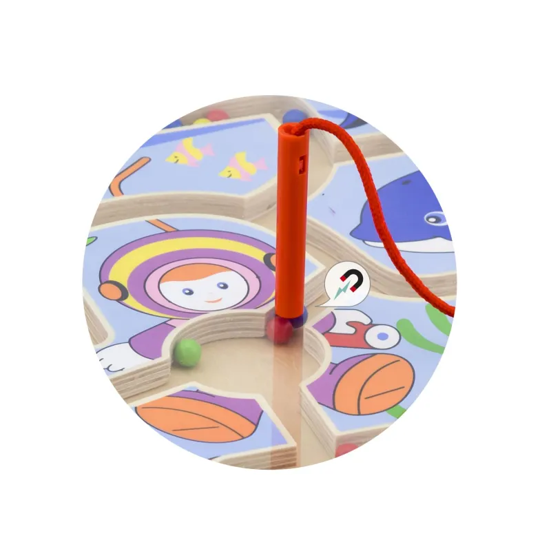 Medinėje lentoje yra piešinys, vaizduojantis povandeninį pasaulį, ir kamuoliukų labirintas;