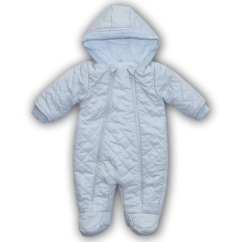 Pašiltintas 100% medvilnės vidus. Kombinezonas kūdikiams su gobtuvu ir uždaromis kojytėmis.