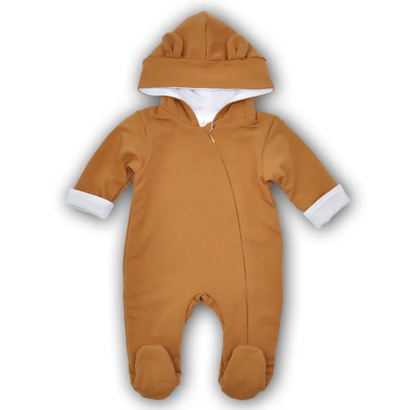 Pašiltintas 100% medvilnės kombinezonas kūdikiams su gobtuvu ir uždaromis kojytėmis.
