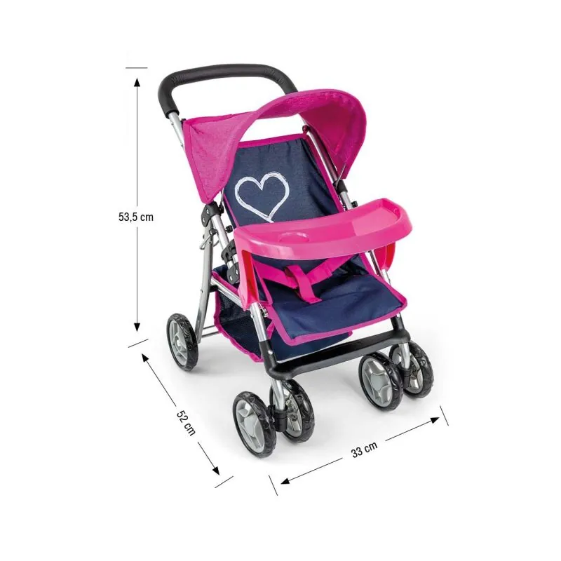 Jame yra sulankstomas rėmas, padėklas, saugos diržai ir pasukami priekiniai ratai.