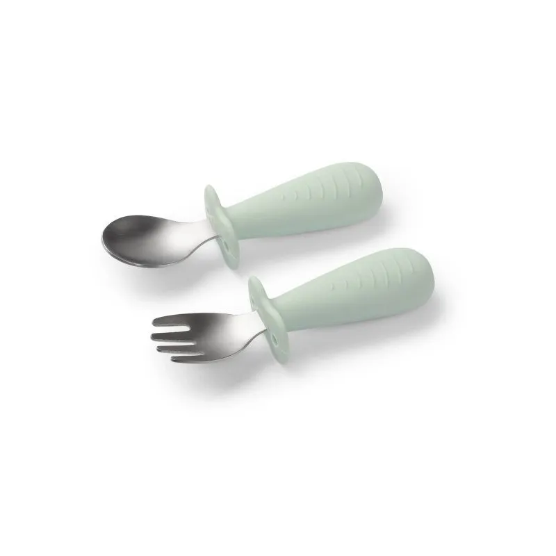 Šaukštas ir šakutė pagaminti iš patvaraus, korozijai atsparaus nerūdijančio plieno. Rankenėlės – iš BPA neturinčio, maistinio silikono, kuris užtikrina neslystantį sukibimą. Šie įrankiai tarnaus jūsų vaikui ilgą laiką;
