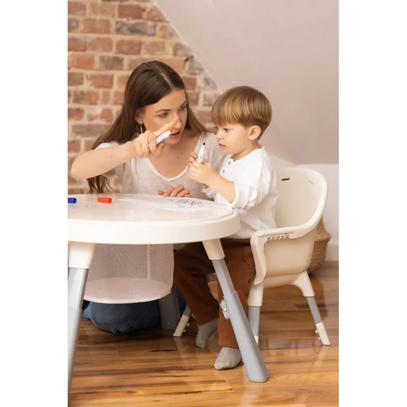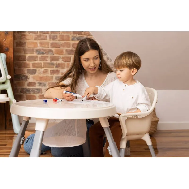 Keliais judesiais iš aukštos kėdės virsta stilinga kėdė + stalo komplektas.