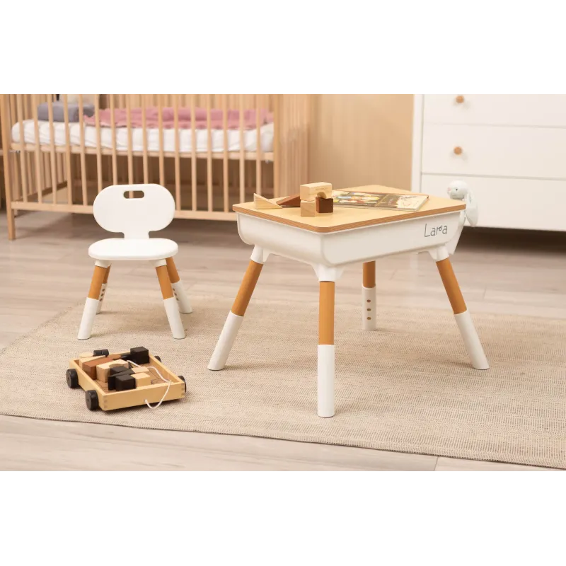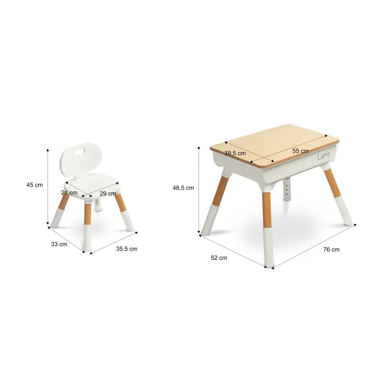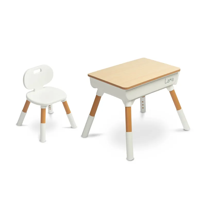 Lara yra universalus stalas, puikiai tinkantis žaidimams, mokymuisi ar valgymui. Gerai apgalvoti matmenys suteikia jūsų vaikui pakankamai erdvės piešti, konstruoti iš kaladėlių ar naudotis edukacinėmis knygelėmis. Dėl funkcionalaus aukščio reguliavimo, tiek „Lara“ stalą, tiek kėdę galima lengvai pritaikyti prie vaiko ūgio.