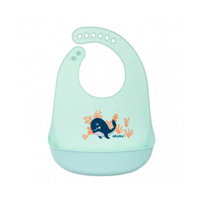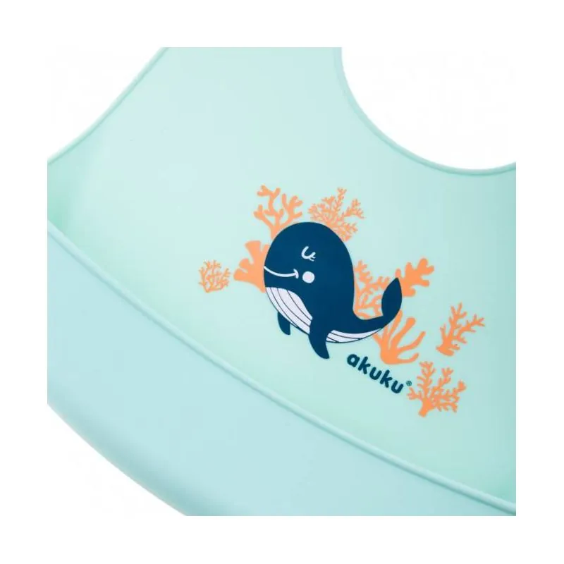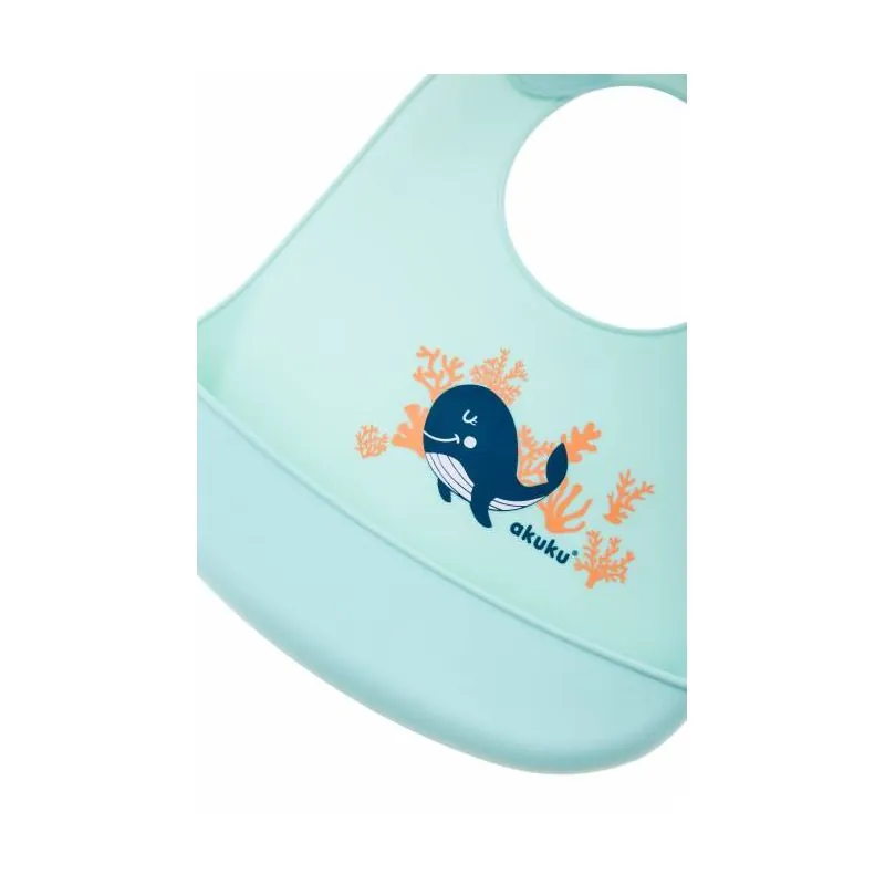 Silikoninis seilinukas Akuku Whale – praktiškas ir patogus aksesuaras, kuris labai palengvins kūdikio maitinimą tiek namuose, tiek pasivaikščiojant. Seilinukas turi patogią kišenę, kuri sustabdo krintančius maisto likučius. Priemonė ne tik apsaugo drabužius nuo nešvarumų, bet ir yra itin lengvai bei greitai valoma.