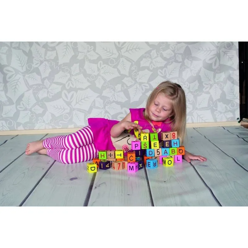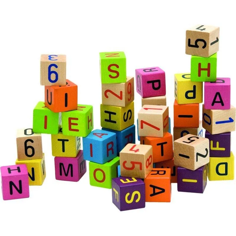 Medinių kaladėlių rinkinys. Kaladėlės dekoruotos raidelėmis ir skaičiais iš kurių galima sudėti lengvus pagrindinius žodžius, mokytis raidelių bei skaičių.