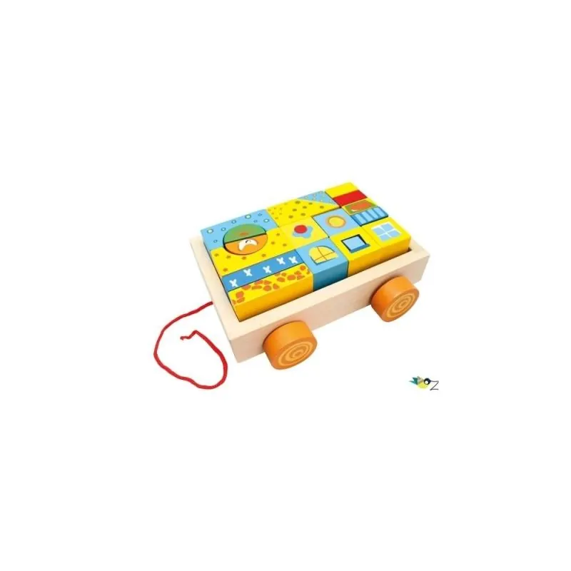Medinis traukiamas vežimėlis su 19 skirtingų spalvų medinių kaladėlių. Iš šių blokų, jūsų vaikas sukurs namus, miestus ar net pilis. Jūsų mažyliui nepritrūko idėjų ilgą laiką.
