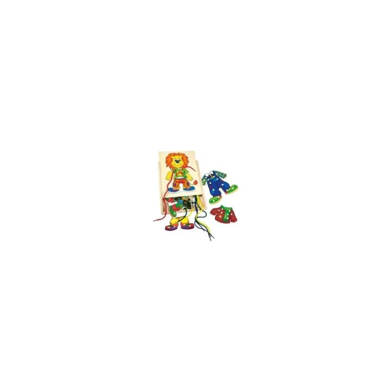 - vaikas gali "prisiūti" drabužėlius prie liūto, naudodamas 4 skirtingų spalvų raištelius,