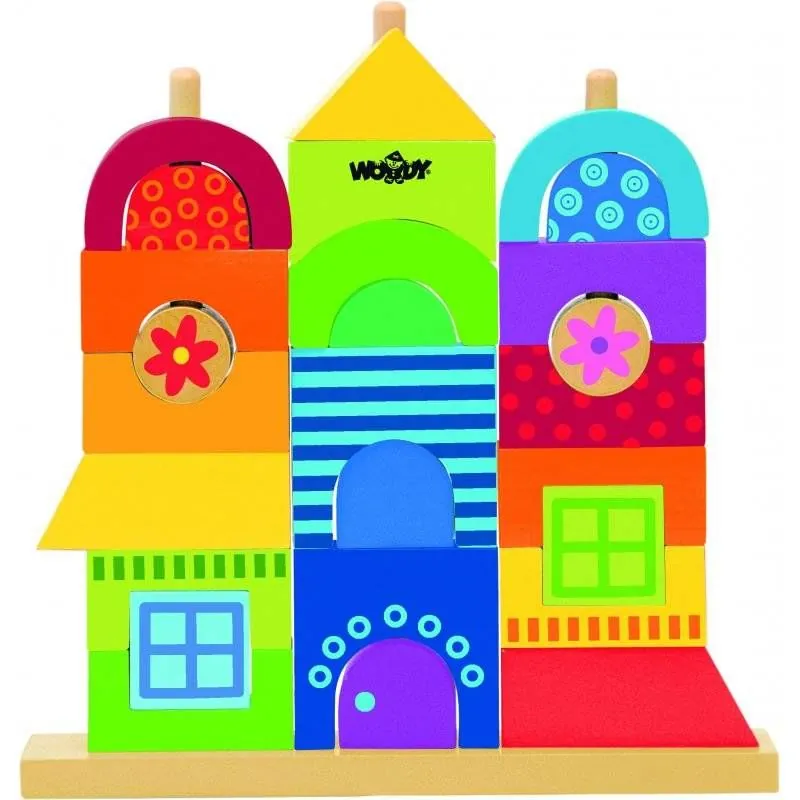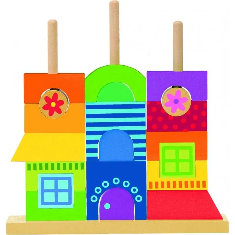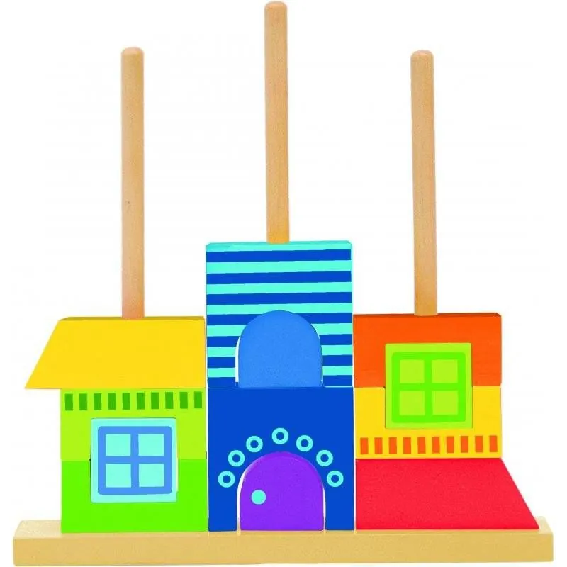 Medines kaladėles reikia suverti ant 3 kaiščių tokių būdu, kad gautųsi linksmas spalvingas namelis.